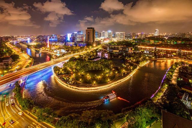 江宁路桥在节日张灯结彩时尤为动人,高楼俯拍,能同时收下桥、河与人的活动场景。