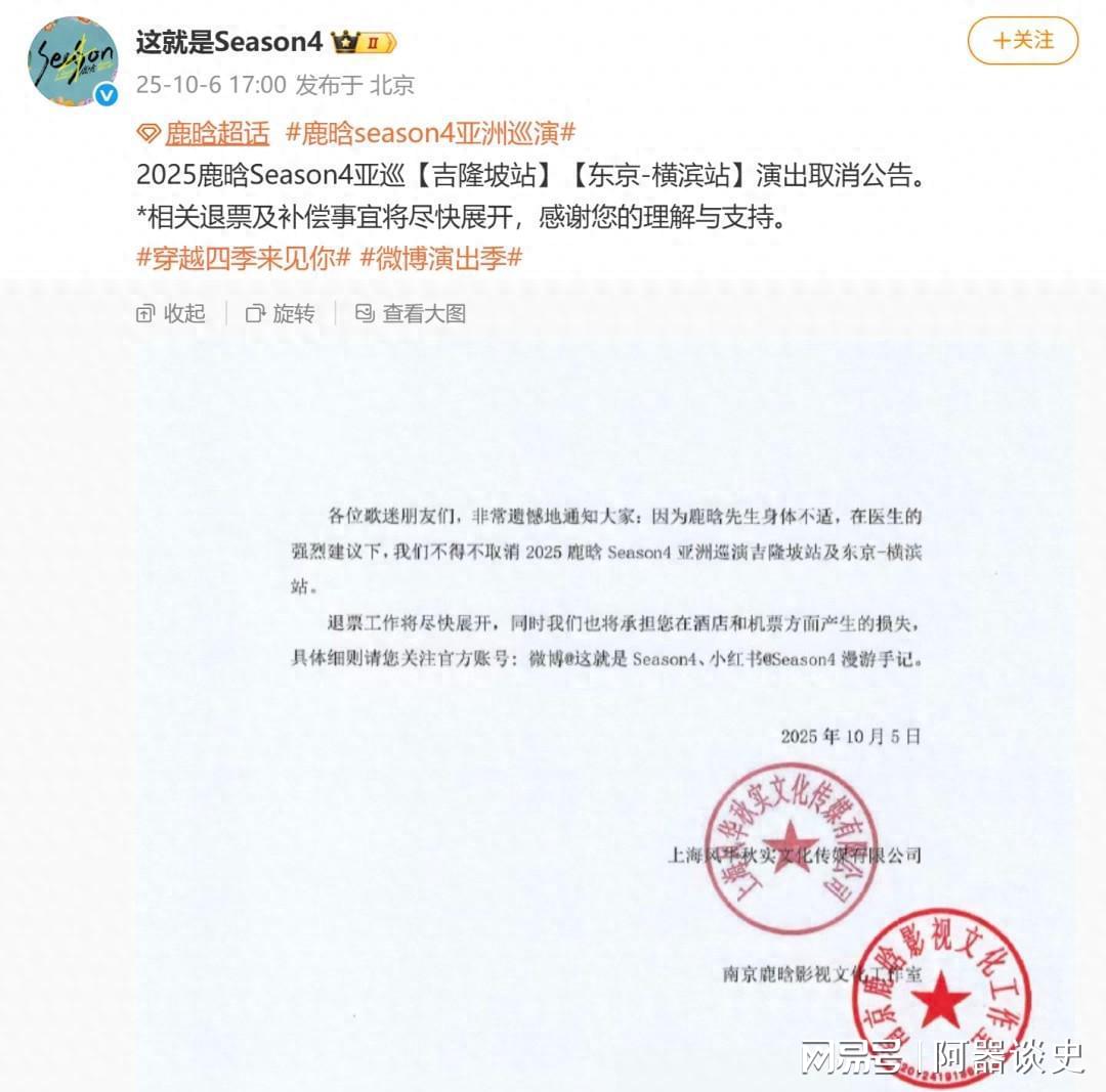 10月6号那天,鹿晗巡演的官号发声明,说他因为身体状况不佳,在医生强烈要求下,不得不取消吉隆坡和东京两站的演唱会。