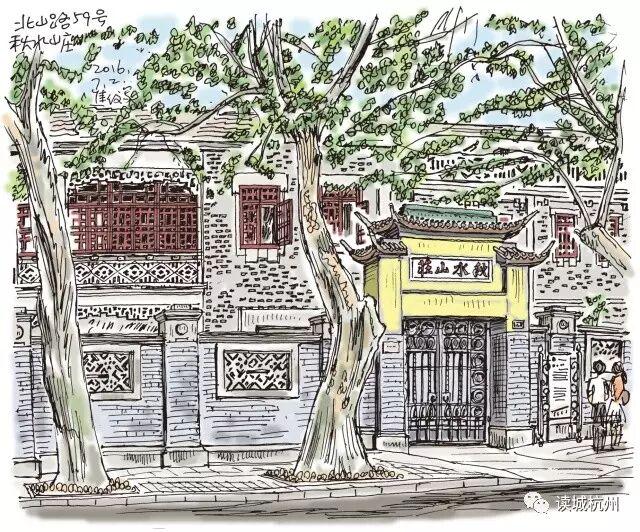 “我把秋水山庄的门楼仍绘成从前的黄颜色,这是《申报》报主史量才以他爱妻沈秋水命名而建的江南庭院式建筑。在北山路走一圈,有关历史人物也有好多:白居易、苏轼、林和靖、岳飞、林启、陈夔龙、秋瑾、孙中山、张静江、苏曼殊、孙传芳、刘锦藻、吴昌硕、黄宾虹、丰子恺、陈布雷、连横……”