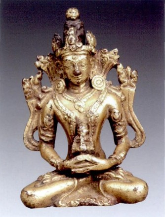 第五是禅定印,这是佛陀入于禅定时所结的手印,表现禅定中的佛都用此印。如图18,通体鎏金,高肉髻,面方圆,微笑,丰颐大耳,法相庄严,身披“右袒式”佛衣,跏趺坐姿,两手平放于腿上,仰放下腹前,右手置左手上,两拇指相接,全神贯注。通高16厘米,重0.6公斤。图19通体鎏金,头戴高宝冠,冠与肩臂部似饰“六拏具”,佩珠璎项圈。图20头戴高宝冠。还有图21、22稍与前述有所不同。