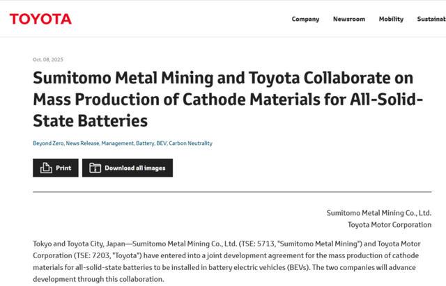 10月8日,丰田汽车全球官网发布消息称,住友金属矿山株式会社(以下简称“住友金属矿山”)与丰田汽车就量产用于纯电动汽车(BEV)的全固态电池正极材料达成合作协议。双方将通过此次合作推进研发进程。丰田汽车还在文内重申,计划于2027年至2028年间推出搭载全固态电池的纯电动汽车。