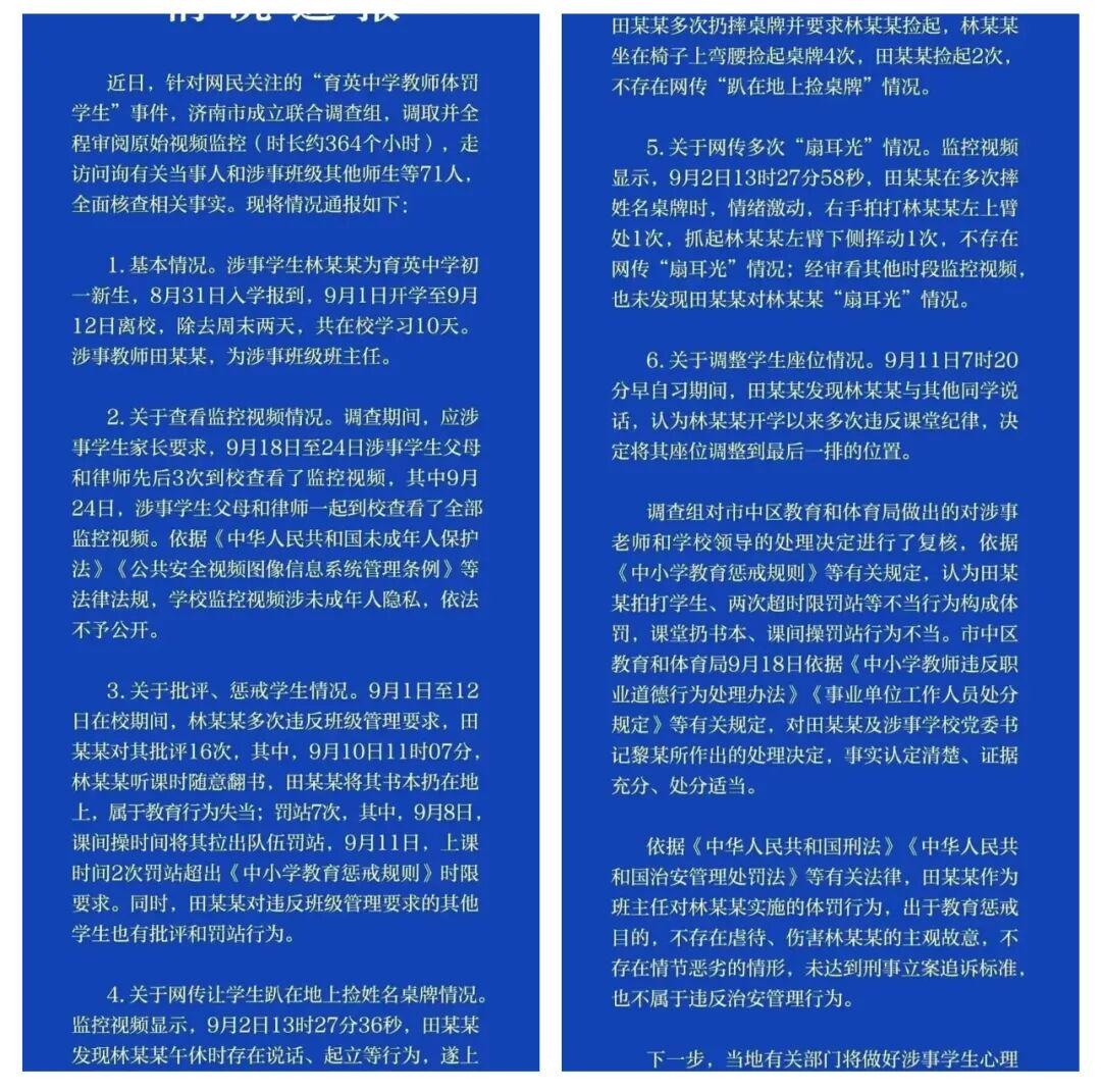 9月18日,济南市市中区教体局发布《情况通报》称,经查,2025年9月开学两周内,该校初一年级某班主任田某某在班级管理过程中,存在对学生林某某体罚等不当行为。决定对田某某给予记过处分,调离工作岗位;对学校党委书记黎某给予诫勉,并责成向学生及家长赔礼道歉。