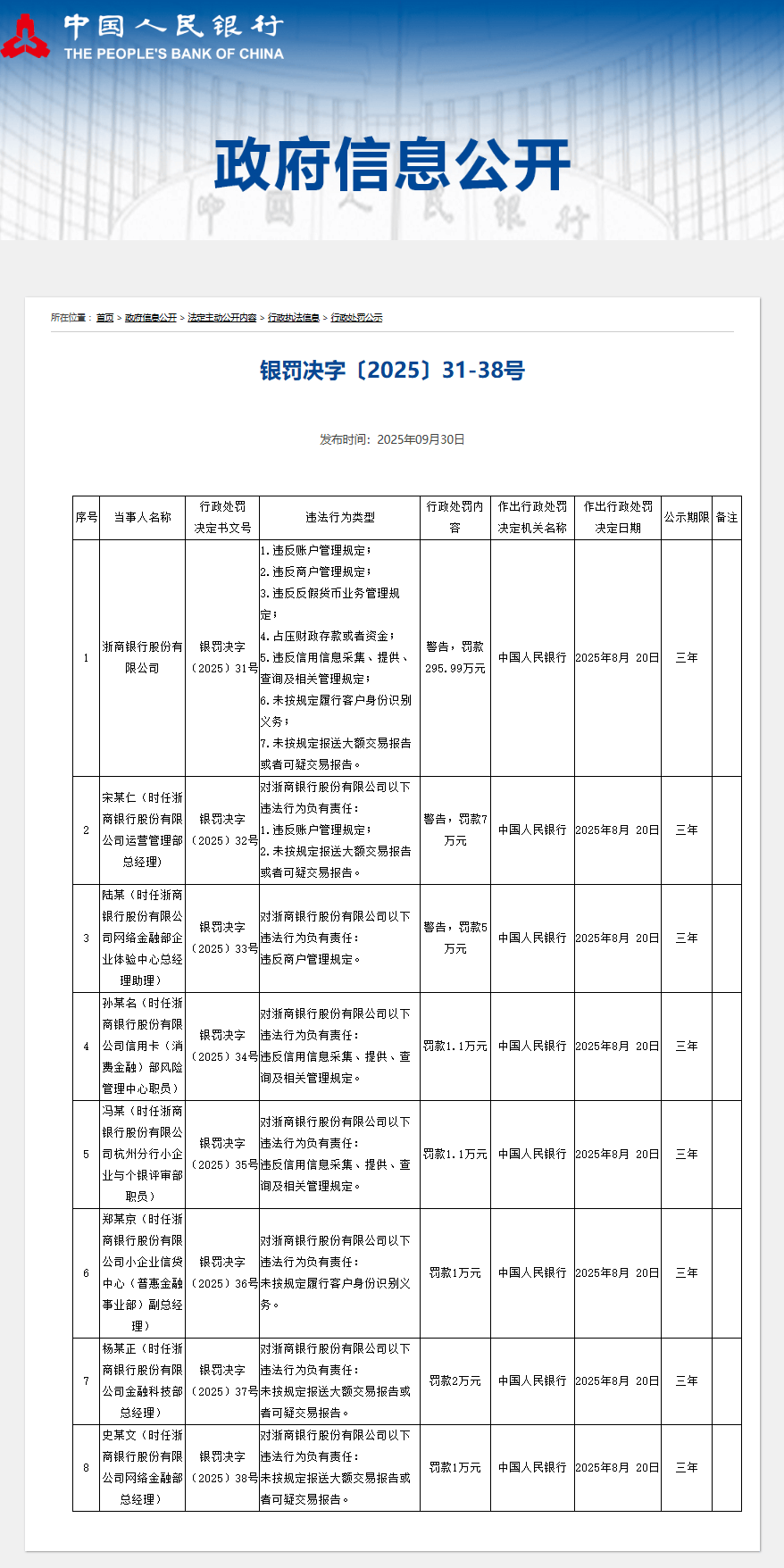 据柒财经不完全统计,截至目前(2025年10月),浙商银行年内已被监管部门开出至少20张罚单,累计罚没金额超过3500万元,远超2024年全年(21张罚单,合计约1364万元)。