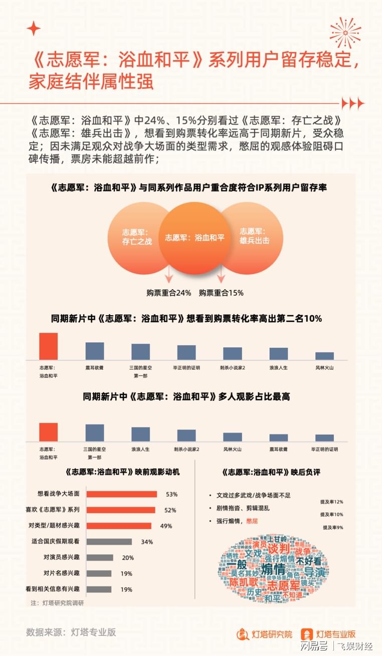《志愿军:浴血和平》中24%、15%分别看过《志愿军:存亡之战》《志愿军:雄兵出击》,想看到购票转化率远高于同期新片,受众稳定;因未满足观众对战争大场面的类型需求,憋屈的观感体验阻碍口碑传播,票房未能超越前作;