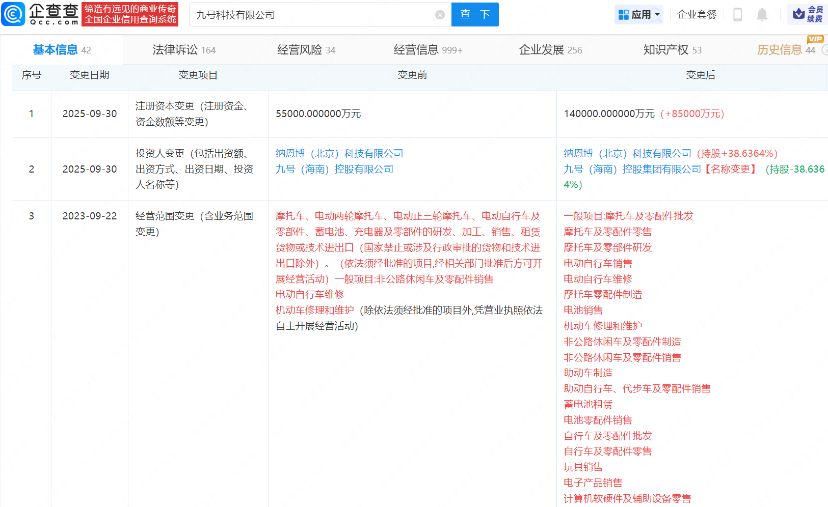 企查查APP显示,近日,九号科技有限公司发生工商变更,注册资本由5.5亿元增至14亿元,增幅约155%。企查查信息显示,该公司成立于2018年9月,法定代表人为张珍源,经营范围包含摩托车及零配件批发、助动车制造、电子产品销售等,由纳恩博(北京)科技有限公司、九号(海南)控股集团有限公司共同持股。