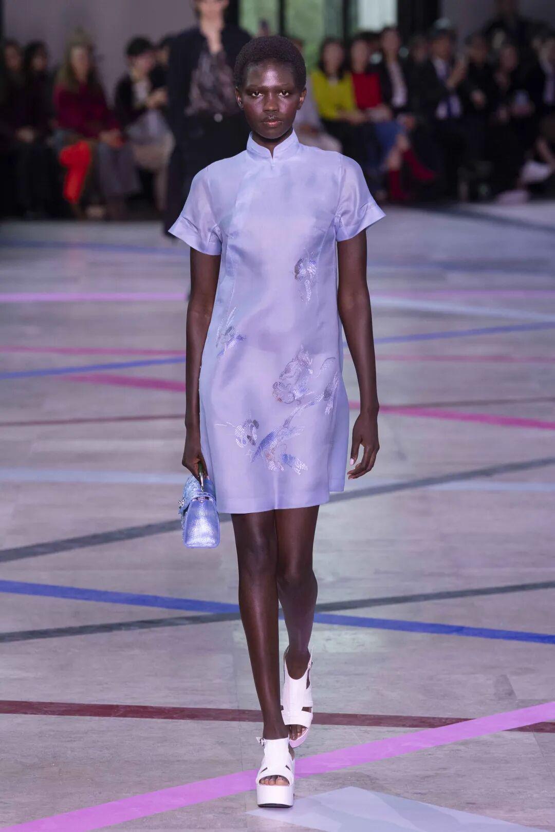 大秀现场嘉宾云集。品牌代言人刘宇身着SHIATZY CHEN特别定制的刺绣长袍亮相前排,工匠以精致的参针绣工艺展现华丽细节,刺绣图案融合玫瑰和马鞭草元素,并镶嵌玉石点缀花心,整体图案融入本季马元素。
