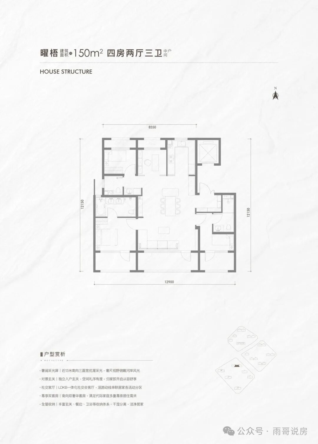 150㎡:四居,非临河一排,中间户;南向面宽12.9米(客厅5.7米),主卧套面宽3.9米;有独立玄关,南向内嵌阳台+北向设备平台的赠送