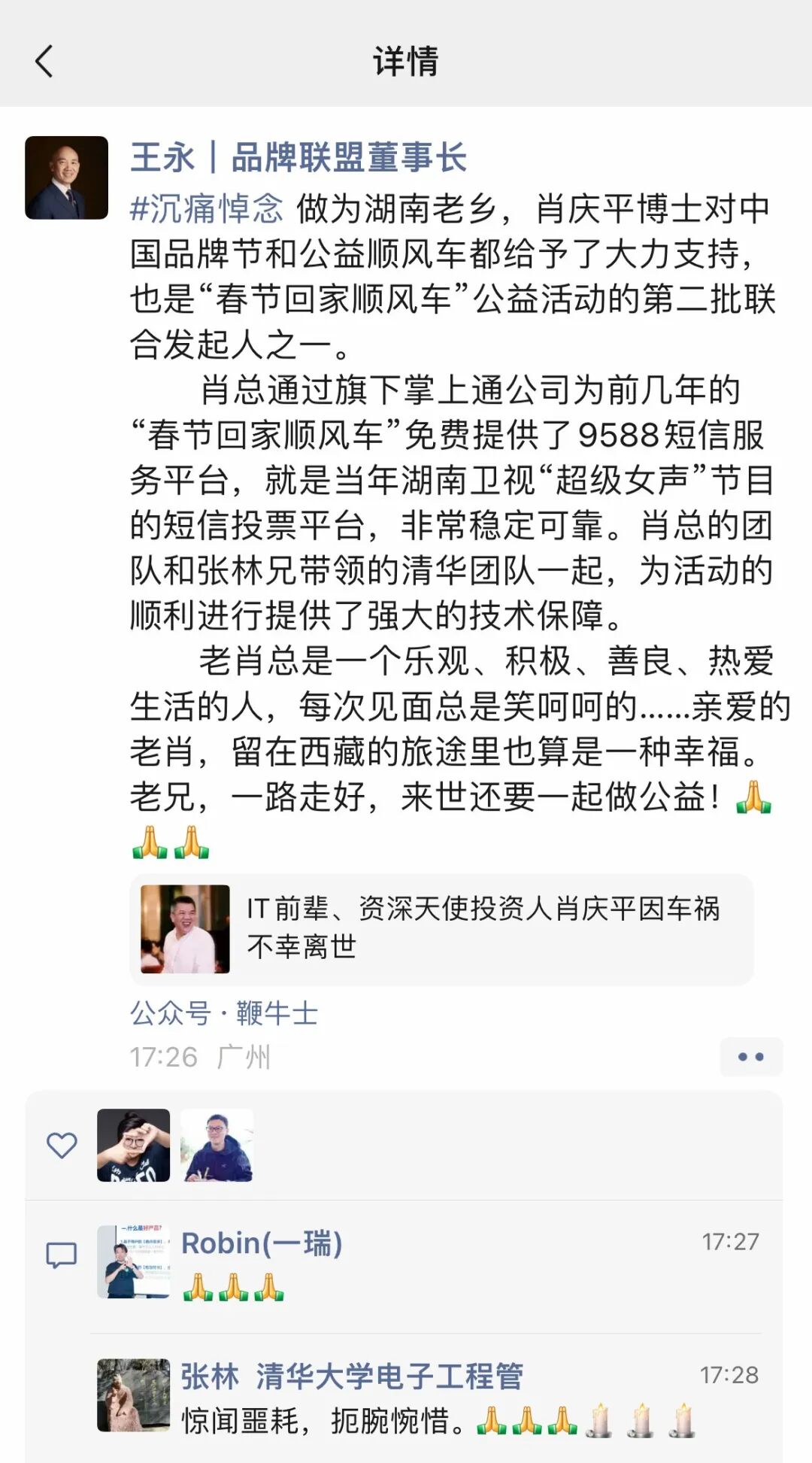 “老肖总是一个乐观、积极、善良、热爱生活的人,每次见面总是笑呵呵的……”好友王永的怀念,勾勒出一个温暖而鲜活的形象。噩耗传来,前央视主持人、公益顺风车联合发起人赵普,公益顺风车法律顾问岳屾山,清华大学前教授张林先生,以及北京车友协会和公益顺风车群里大家纷纷留言悼念念这位公益人。