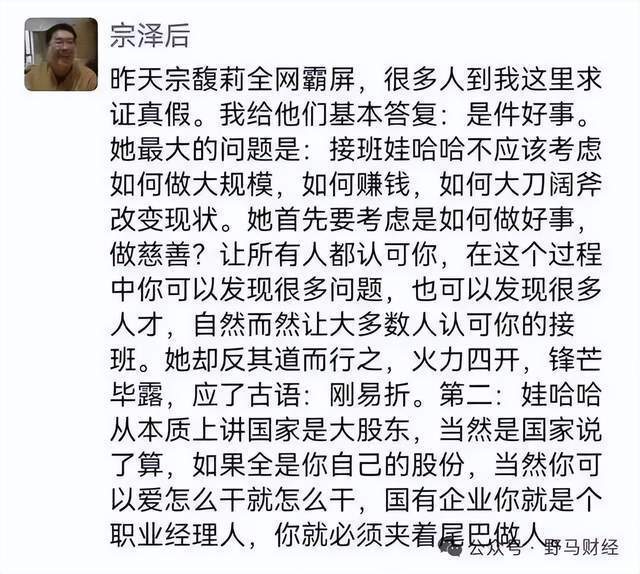 当时,宗庆后胞弟宗泽后在在朋友圈中写道,“她(宗馥莉)最大的问题是:接班娃哈哈不应该考虑如何做大规模,如何赚钱,如何大刀阔斧改变现状。她首先要考虑是如何做好事做慈善?让所有人都认可你,在这个过程中你可以发现很多问题,也可以发现很多人才,自然而然让大多数人认可你的接班。她却反其道而行之,火力四开,锋芒毕露,应了古语:刚易折。”