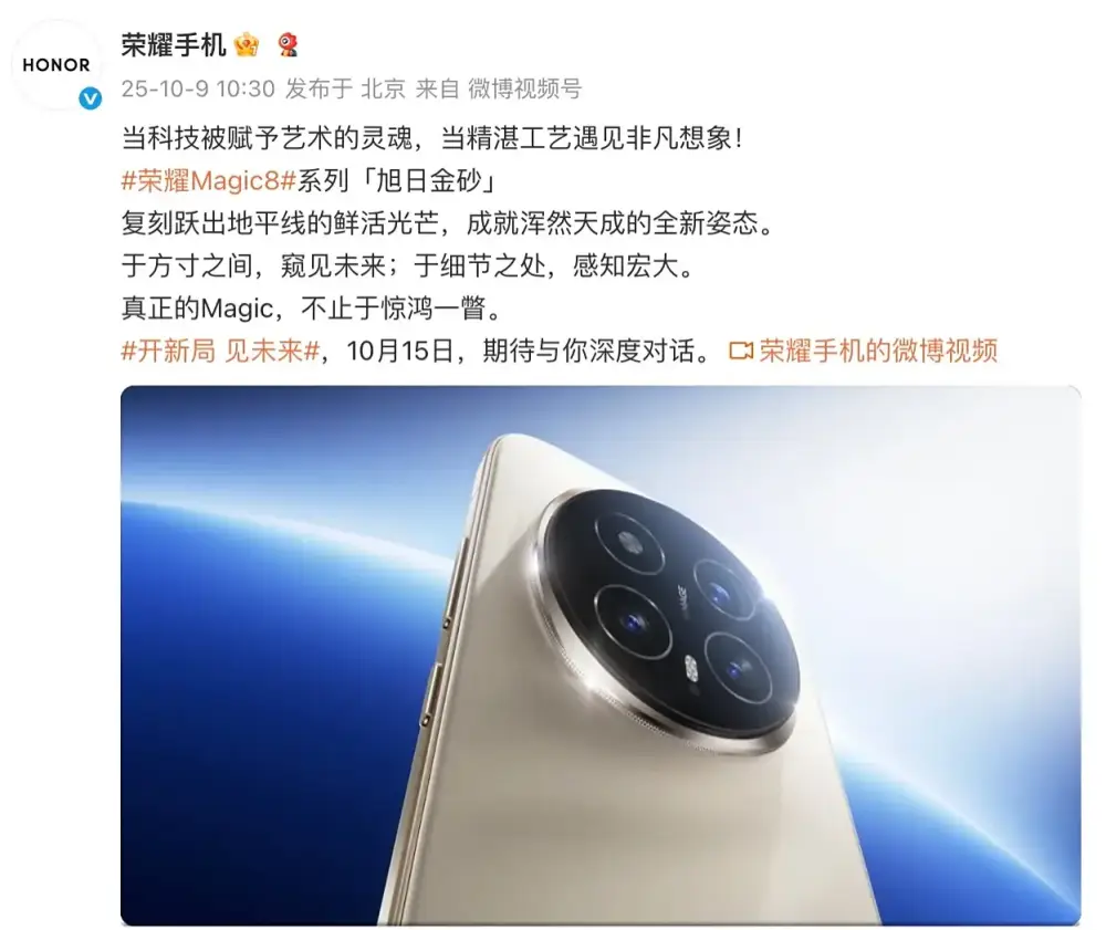 外观设计方面,Magic8 Pro 提供旭日金砂、天青色、雪域白与绒黑色四种配色。 其中「旭日金砂」灵感来源于晨曦映照云海的暖金光泽,质感细腻高级。 标准版则独有「天青釉」配色,设计灵感源自宋代汝瓷,还原了「雨过天青」的温润视觉,并在背板中融入汝窑开片釉变元素,光线流转时可见蝉翼纹的微妙变化。