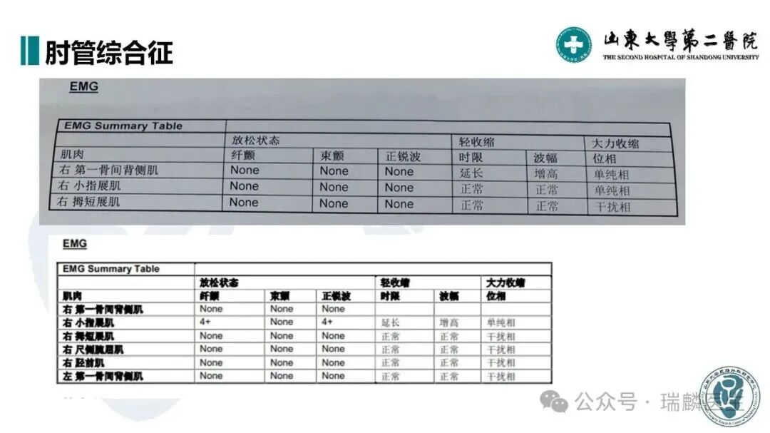 尺神经经肘部传导速度减慢(<40m/s需手术)。