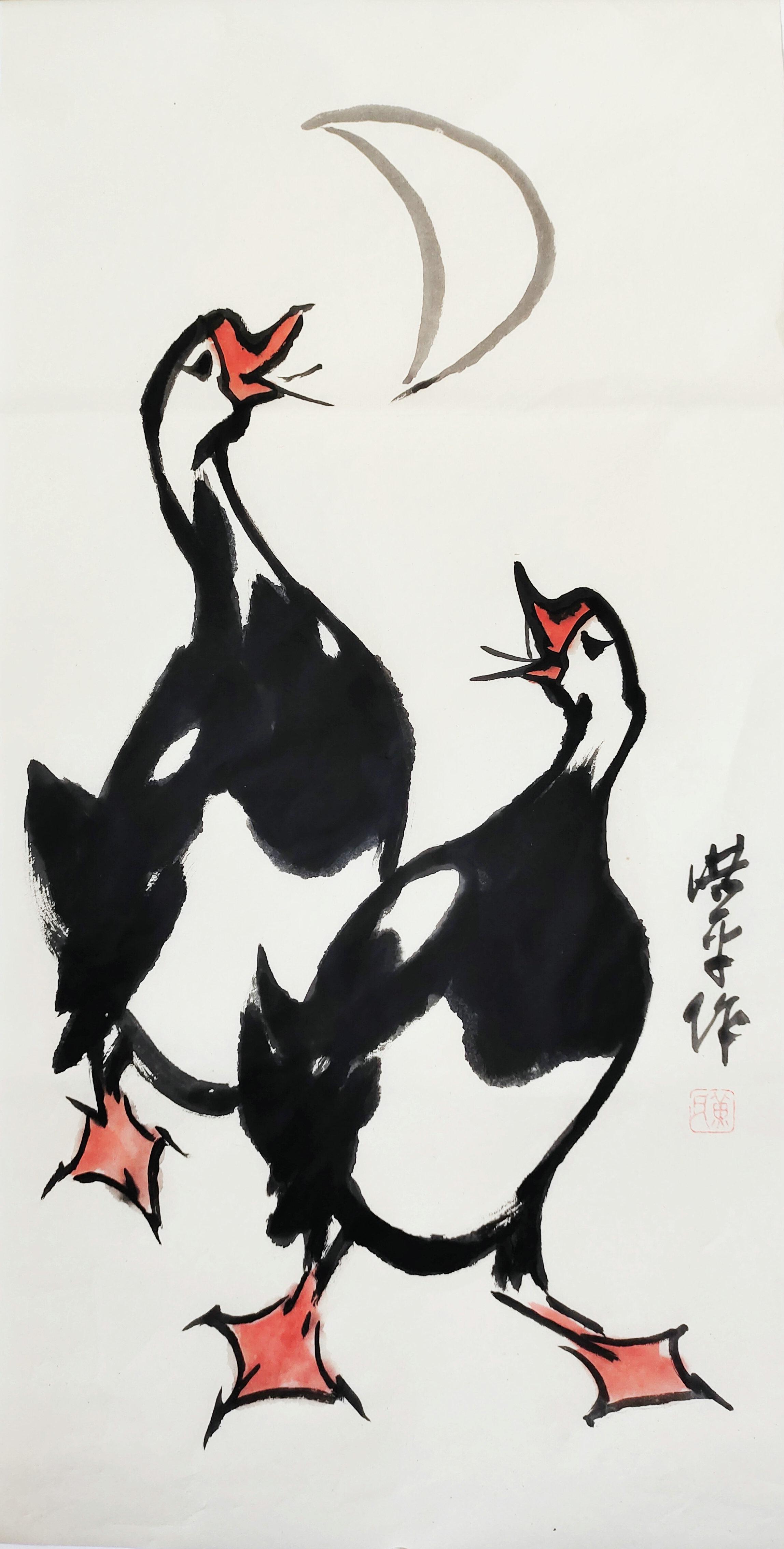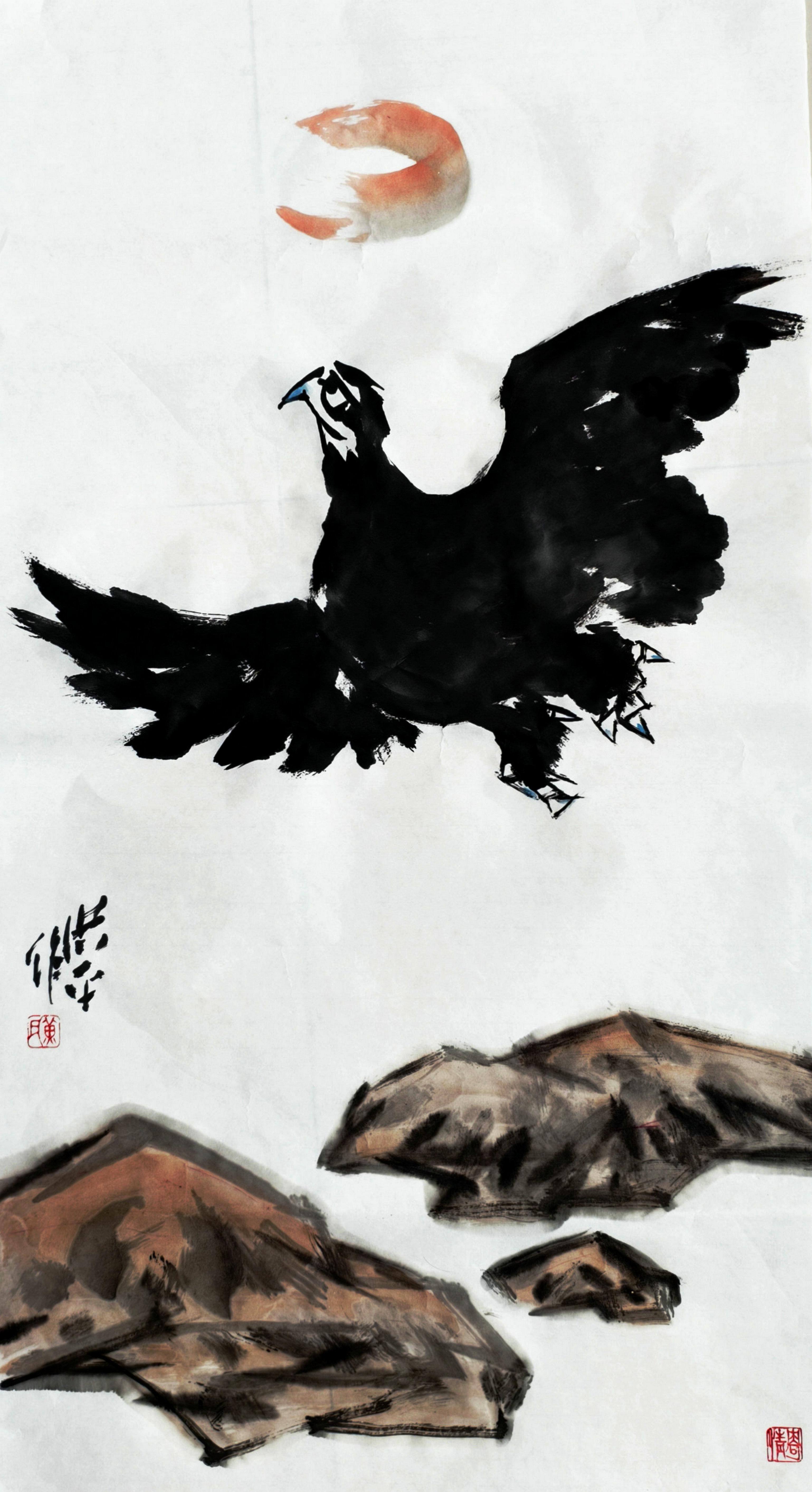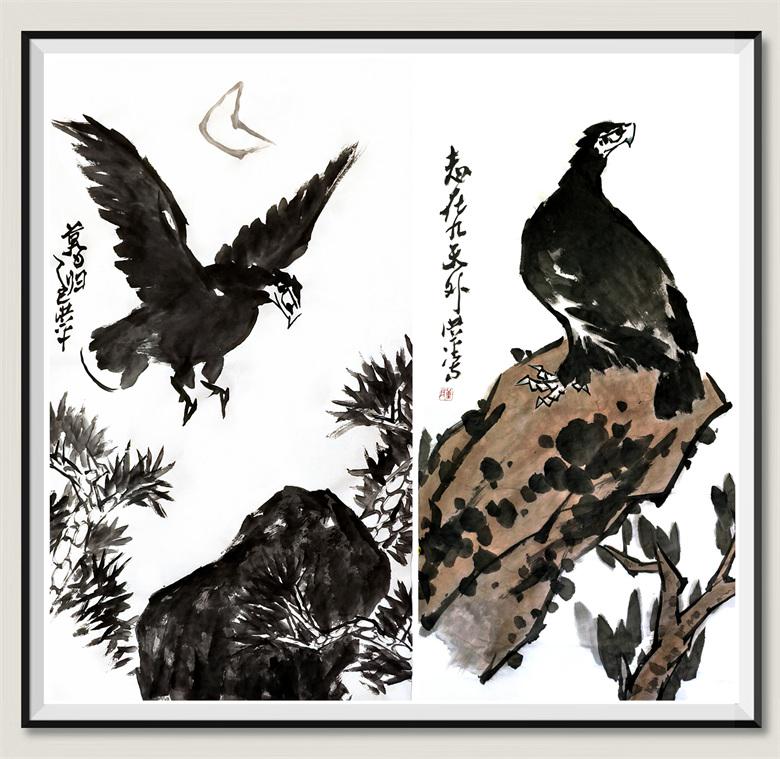 在表现手法上,他常以略带夸张的造型为基础,融入现代构成理念,依矛盾法则统筹画面布局。其中,雄鹰是其代表性题材,作品既吸收历代画鹰名家的艺术精华,又融入个人情感,通过工写结合、收放自如的笔墨,以拟人化手法赋予雄鹰鲜活的艺术生命力。