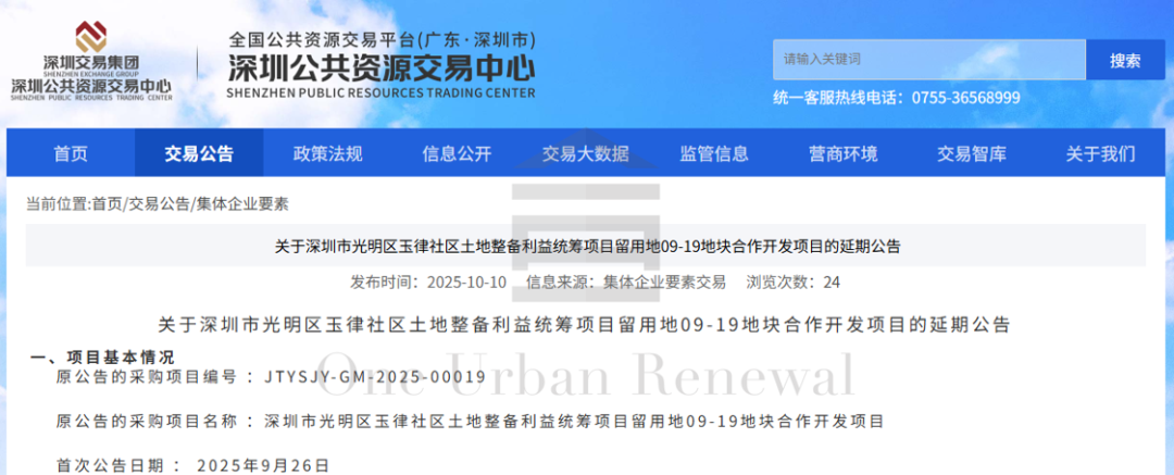深圳公共资源交易中心关于深圳市光明区玉律社区土地整备利益统筹项目留用地09-19地块合作开发项目的延期公告。