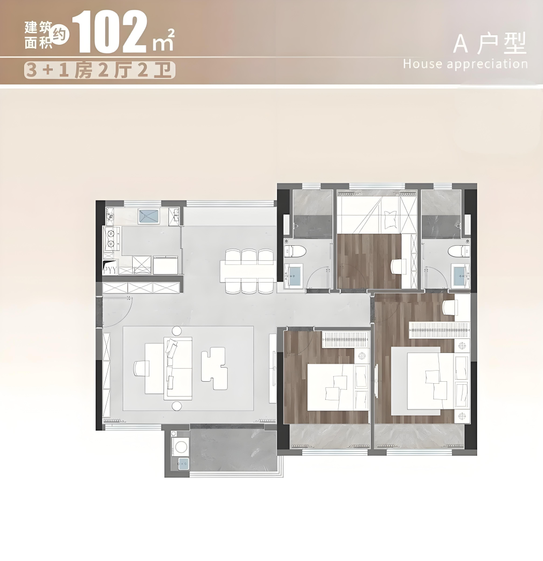 譬如建面约102㎡户型,有3+1房、4房两种交付选择,契合不同家庭居住需求。
