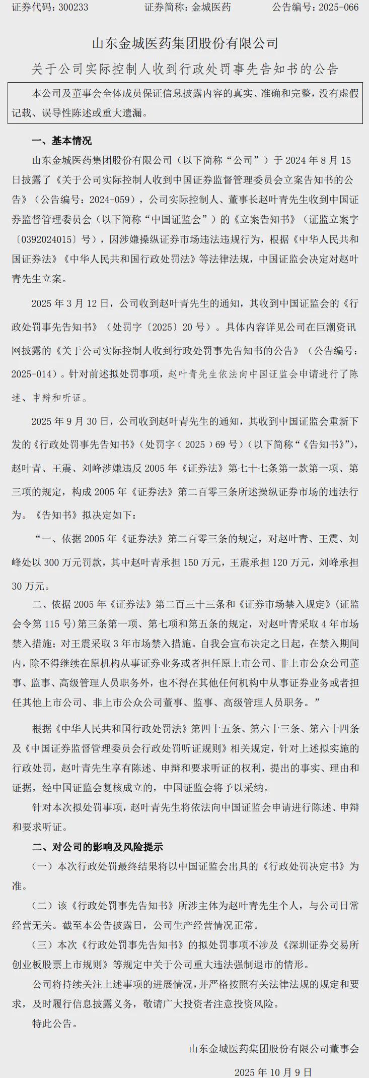 山东金城医药集团股份有限公司(简称:金城医药)公告,9月30日,公司收到实际控制人、董事长赵叶青的通知,因涉嫌操纵证券市场违法违规行为,其收到证监会重新下发的《行政处罚事先告知书》(处罚字﹝2025﹞69号)。