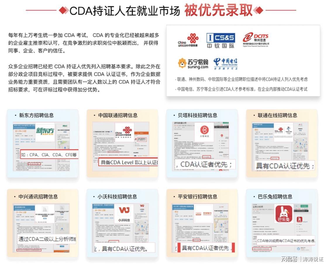 CDA企业认可度非常高,很多企业招聘时注明CDA数据分析师优先,对找工作非常有帮助。很多银行、金融机构的技术岗会要求必须是CDA数据分析师二级以上的持证人。中国联通、央视广信、德勤、苏宁等企业,把CDA持证人列入优先考虑或者对员工的CDA考试给补贴。