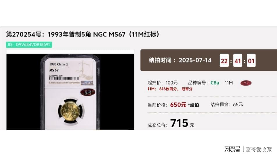 在2025年7月份的“春秋大拍”中,一枚1993年的“梅花5角”,NGC评级67分并带有(11M红标),最后拍出了715元。