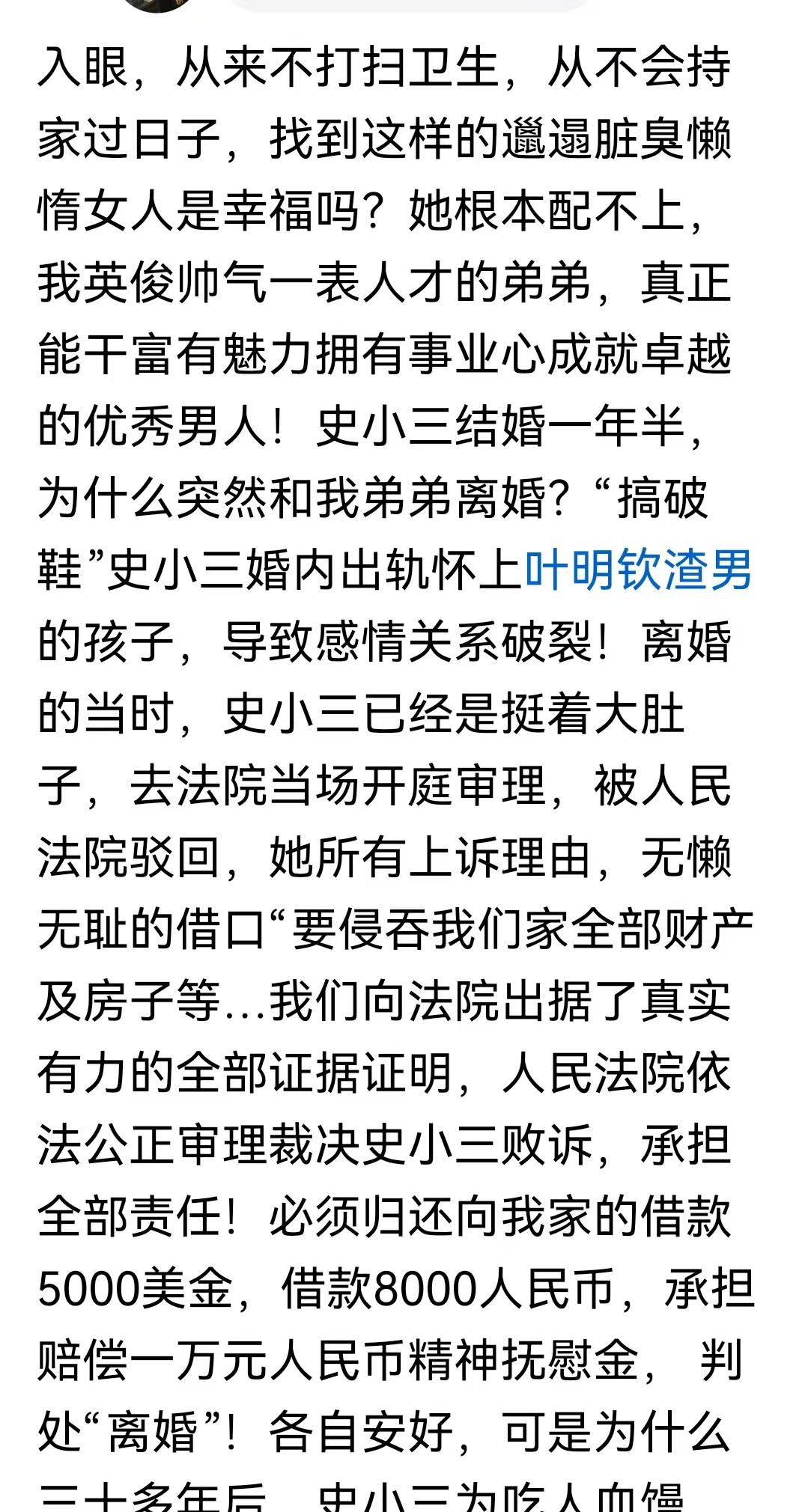 她的爆料,两任前夫确实没有回应。但是,史晓燕第一任前夫的姐姐,回应了史晓燕,说史晓燕是小三,当年和她弟弟结婚期间,爱上了开公司的叶明钦,也就是史晓燕的第二任丈夫,现在的第二任前夫。