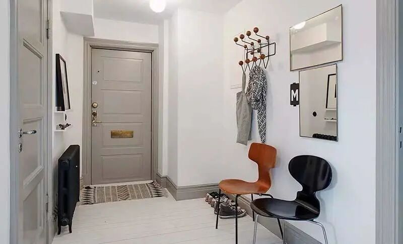 这类玄关设计属于现代极简主义风格类型的装扮,素洁的整体色调,没有很多的东西充斥其中,一张简约地垫、两张换鞋椅、一个多挂钩壁挂架、一面穿衣镜,一盏简单的吸顶灯悬在天花板上,简简单单,清清爽爽。