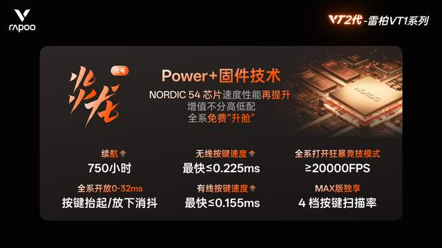性能上,雷柏VT1(二代)系列可谓是直接拉满,百元价格达到千元配置。首发搭载全球首发的NORDIC 54主控芯片,搭配第二代V+无线技术。并且雷柏为其推出的全球首发Nordic 54系列芯片的VT1二代无线电竞鼠标推出了Power+(代号:炎龙)的固件技术,不分高低配,标准版、MAX版均可通过OTA增值。