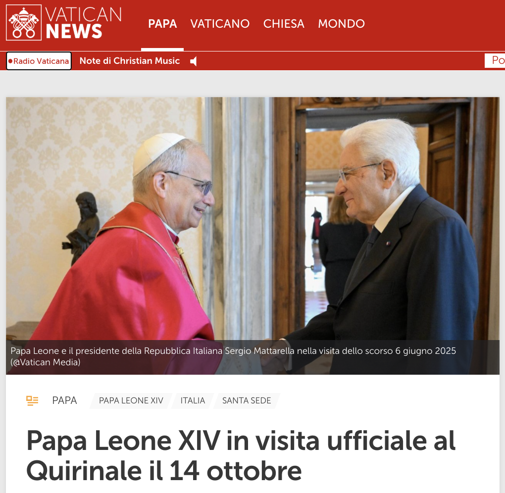 教廷圣座新闻办公室于2025年10月11日发布公告称,教宗良十四世将于2025年10月14日星期二赴意大利总统府奎里纳勒宫(Quirinale,下称“总统府”),与意大利共和国总统马塔雷拉进行正式会晤。