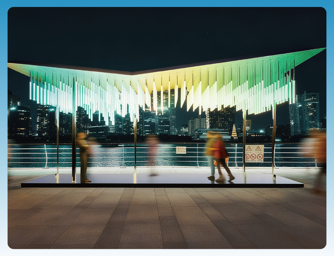 《能量守护林》以33根发光柱象征33棵杉树和3.3万白领精英,通过日光折射与夜间随环境呼吸的灯光,将都市节奏与自然节律相连,呈现个人微小能量汇聚成城市绿色守护的理念。