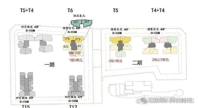 首推一期1栋5单元(45层),91-173㎡3-4房,共232套,以122-175平米4房为主,占比83%,还有两套257平顶复产品。173/257平大户型双电梯独立电梯厅入户,南区91-125平户型3梯4户。