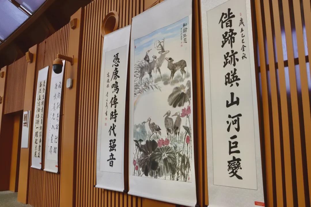 据了解,本次展览展品涵盖40幅书法作品、50幅绘画作品与10幅楹联作品,每一件都紧扣生态主题:书法作品以笔墨传递对自然的敬畏,绘画作品则生动再现麋鹿在湿地栖息、野鸭湖生态盎然的场景,楹联作品更以凝练文字点出“生态保护”核心。