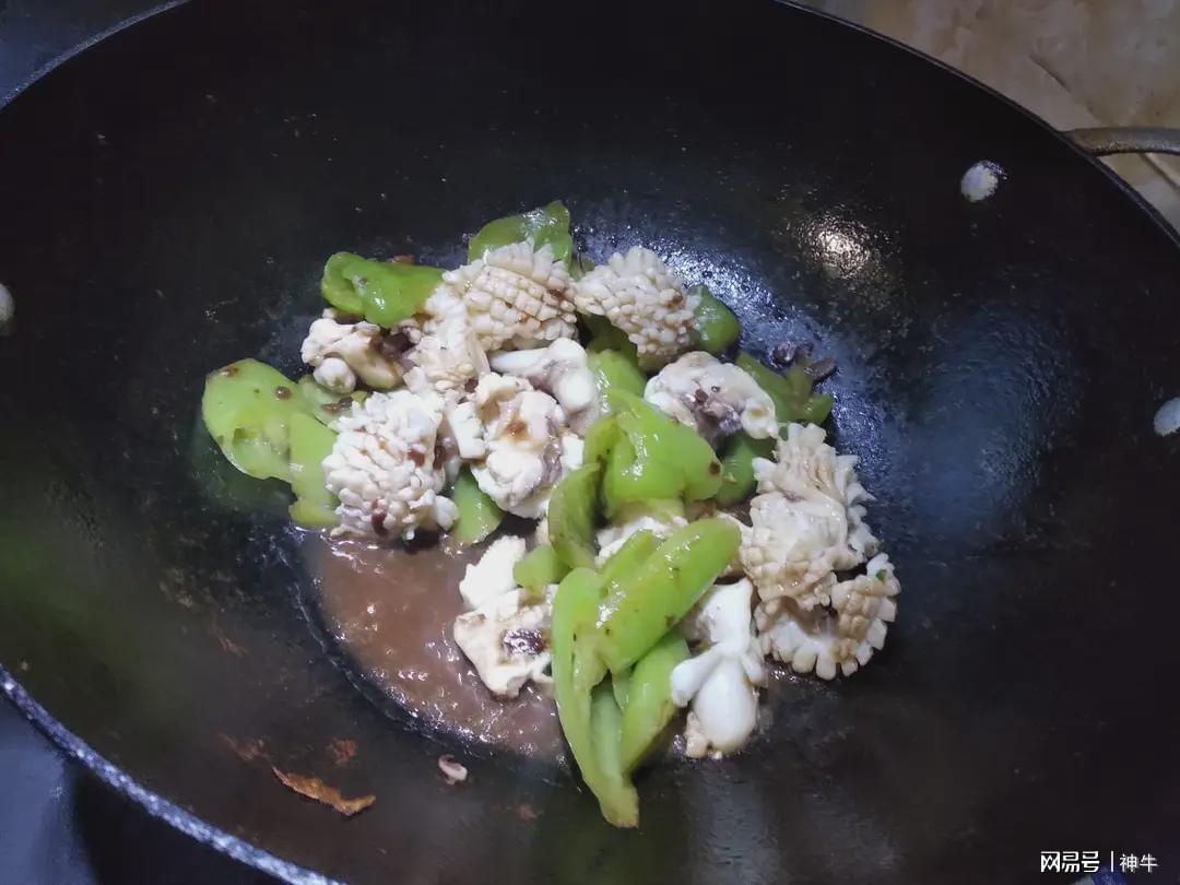 3.锅中入油爆香葱姜蒜,烹入料酒和一品鲜酱油,然后下入过凉后的墨鱼和尖椒翻炒均匀,加入盐和胡椒粉调味后即可出锅享用。