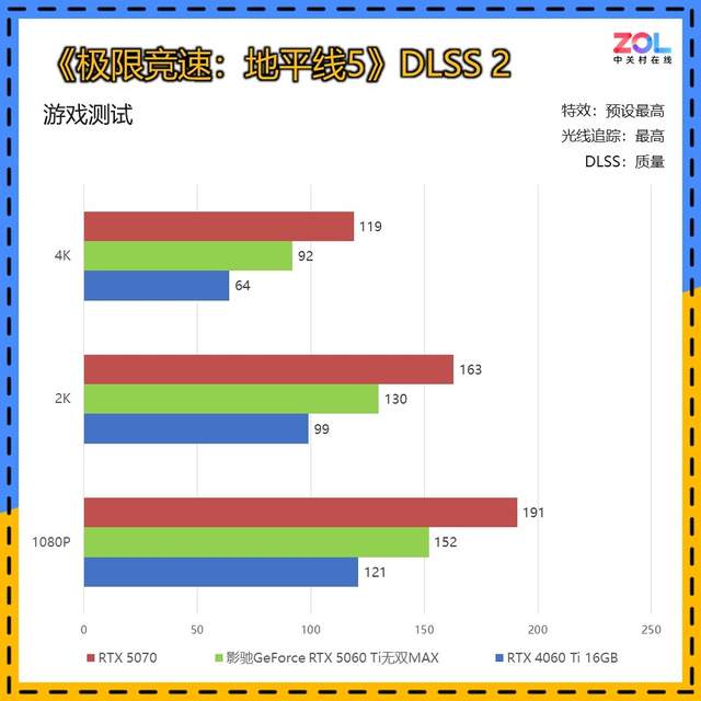 在开启DLSS帧生成后,影驰GeForce RTX 5060 Ti 无双MAX在1080p和2K分辨率下提升较大。不过对于帧数要求不高的赛车游戏,这张RTX 5060 Ti同样可以上到4K分辨率。