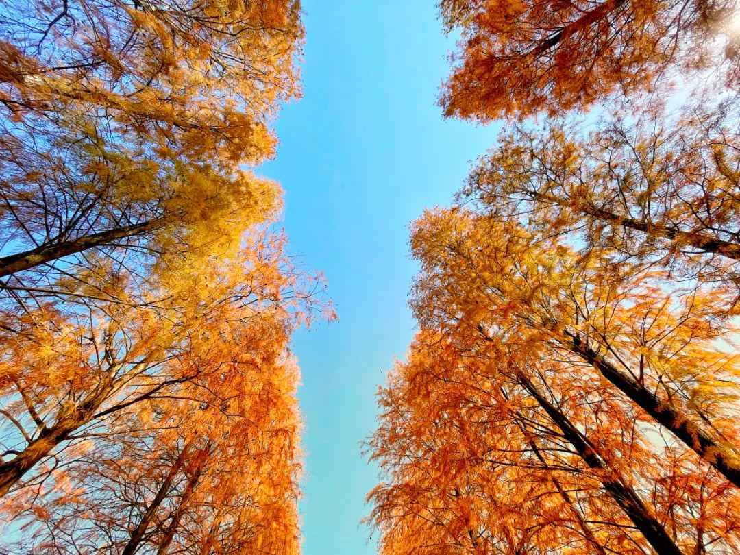 一棵棵又高又直的落羽杉,随着秋日的寒风,将绿色的树叶催得满树锈红,走在公路上,沿路成排飘红的落羽杉映入眼帘。岂一个"美"字可言!