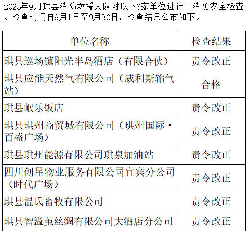 根据《中华人民共和国消防法》和《中华人民共和国政府信息公开条例》规定,宜宾市消防救援支队现将2025年9月份“双随机、一公开”消防监督检查结果进行公示。