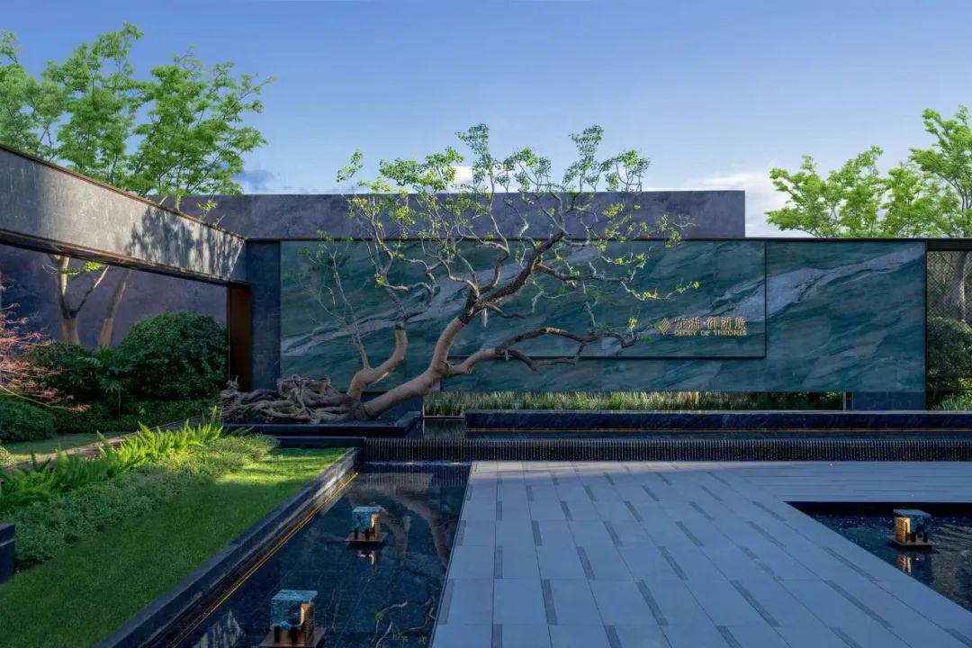 龙湖御湖境二期示范区整块对景仪式照壁选用巴西进口的百达翡翠奢石,整块奢石长10米、高2.5米,大面纹理相连。在百达翡翠奢石前面,是特选的盘龙根造型乌桕,整个根部长2.5米,宽2米,盘根错节,如一条条龙盘踞在地,象征着生命的根基深厚,传递自然和艺术之美。