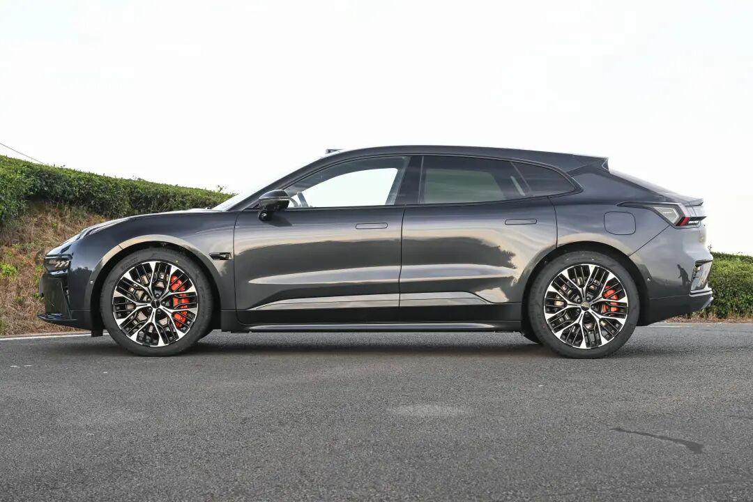侧面造型方面,车身采用了猎装车风格,车顶带着明显的弧度,而且营造出了悬浮式车顶,线条感喜爱你的比较干练;腰线采用了分段式设计,点缀出了车身侧面的层次感;门把手则是弹出式造型,能够起到降低风阻的作用;轮眉和侧裙部分设计有隆起的筋线,有着一定的肌肉感;轮毂采用了多幅式造型,搭配红色卡钳进一步增强了运动感。