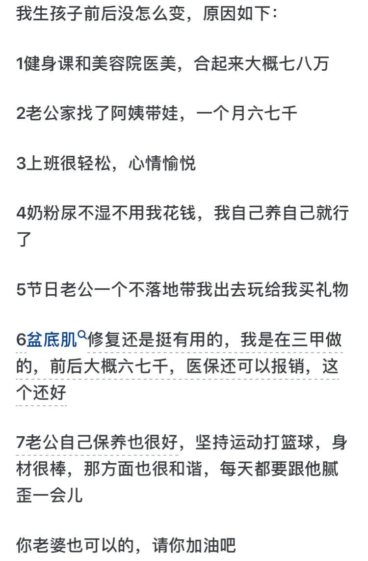 不看点好的,怀孕也不是一无是处啊。我原来是D现在是E,胸型也比之前更饱满了,换衣服得背着爱人的那种。而且好像行动缓慢,人变得更母性了一点,以前咋咋呼呼下个楼梯风风火火,被“思想教育”后行动处弱柳扶风