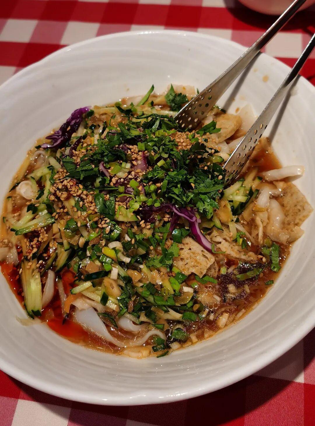 最经典的是西红柿浇汁莜面,窝窝状的莜面吸饱了现炒的番茄绿茄酱汁,酸甜里带着点鲜辣,咬下去筋道滑溜,像把西北的风都卷进碗里。