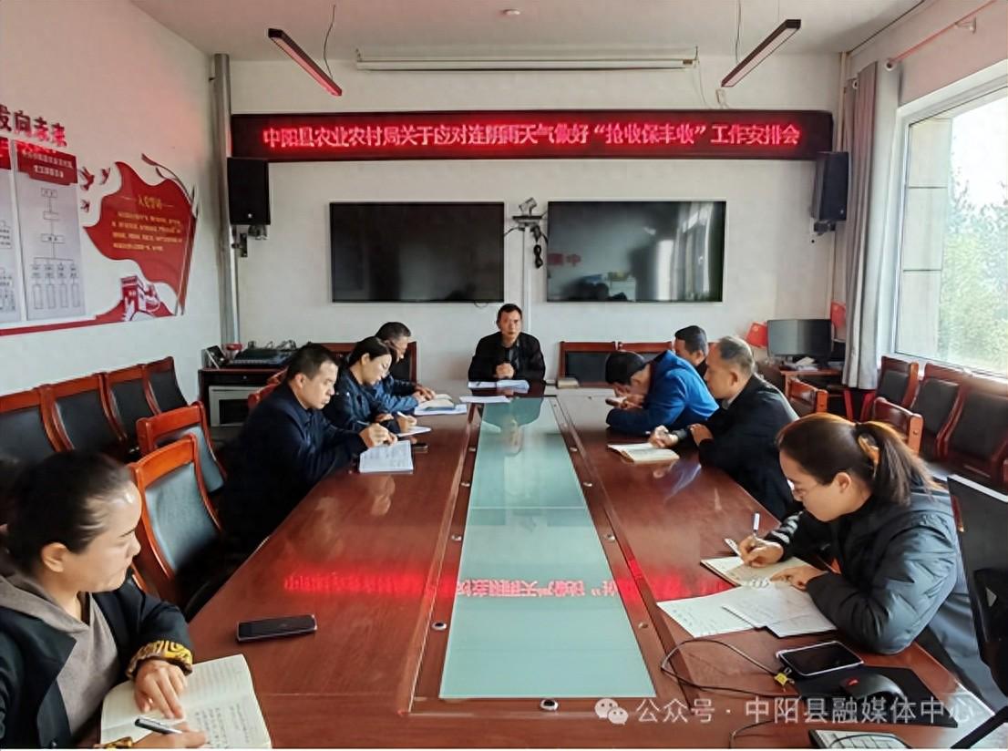 在多日走访摸排基础上,10月12日上午,县农业农村局领导班子召开关于应对连阴雨天气做好“抢收保丰收”工作安排会。班子成员围绕“摸灾情、做指导、问需求、有准备”四方面,各抒己见、建言献策,明确责任分工和工作重点,细化抢收、晾晒等具体事项。