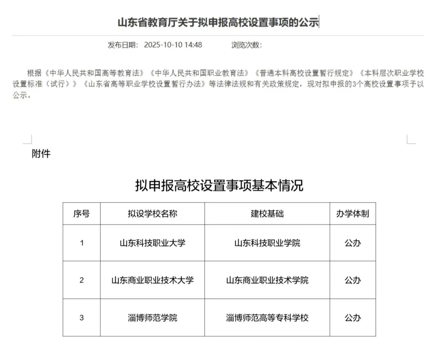 根据山东省教育厅近期发布的《关于拟申报高校设置事项的公示》,将申请设置山东科技职业大学、山东商业职业技术大学、淄博师范学院。