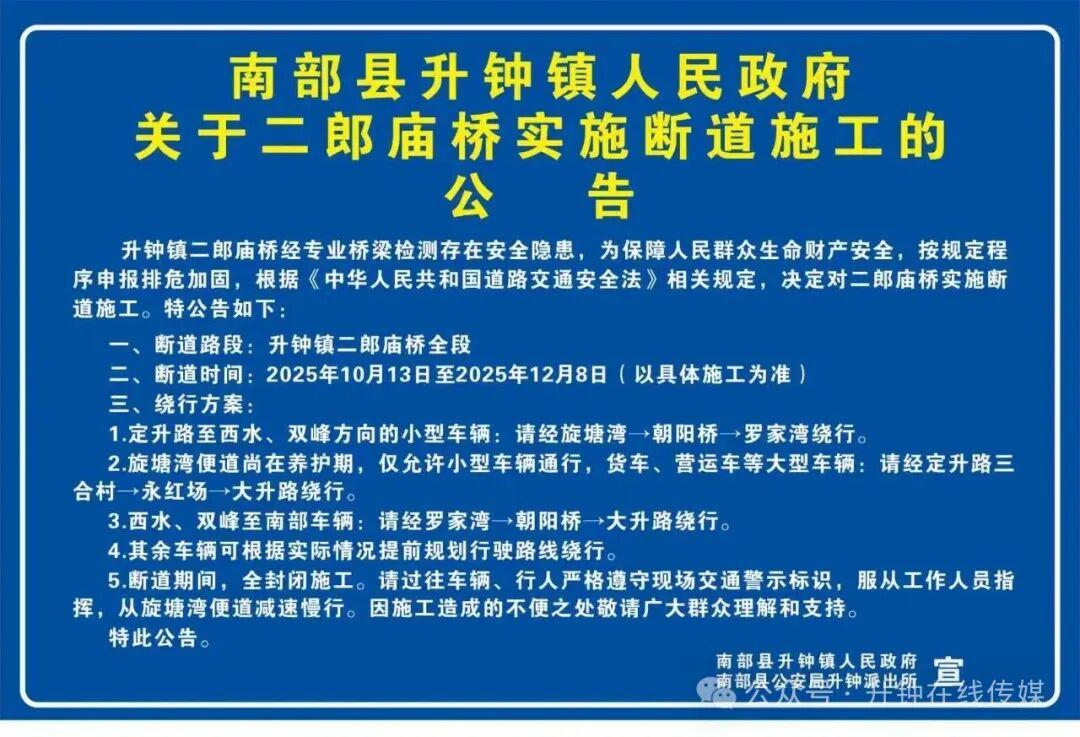 升钟镇二郎庙桥经专业桥梁检测存在安全隐患,为保障人民群众生命财产安全,按规定 程序申报排危加固,根据《中华人民共和国道路交通安全法》相关规定,决定对二郎庙桥实施断道施工。特公告如下: