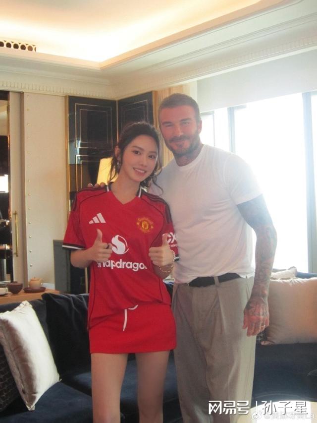 不久前,贝克汉姆与篮球节目主持人美娜一同合影留念。彼时,美娜身着印有贝克汉姆名字的曼联7号球衣。