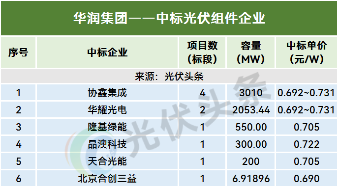 华润在本统计周期,共有10个项目(标段)定标,规模共计6.12GW。协鑫集成、华耀光电、隆基绿能、晶澳科技、天合光能等企业中标。
