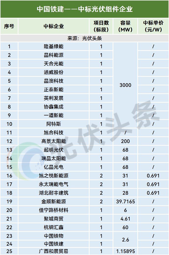 在本统计周期,中国铁建共有21个项目(标段)定标,规模共计3.6GW,隆基绿能、晶科能源、天合光能、通威股份、晶澳科技、正泰新能、英利发展、协鑫集成、一道新能、阿特斯、旭合科技、高景太阳能等中标。