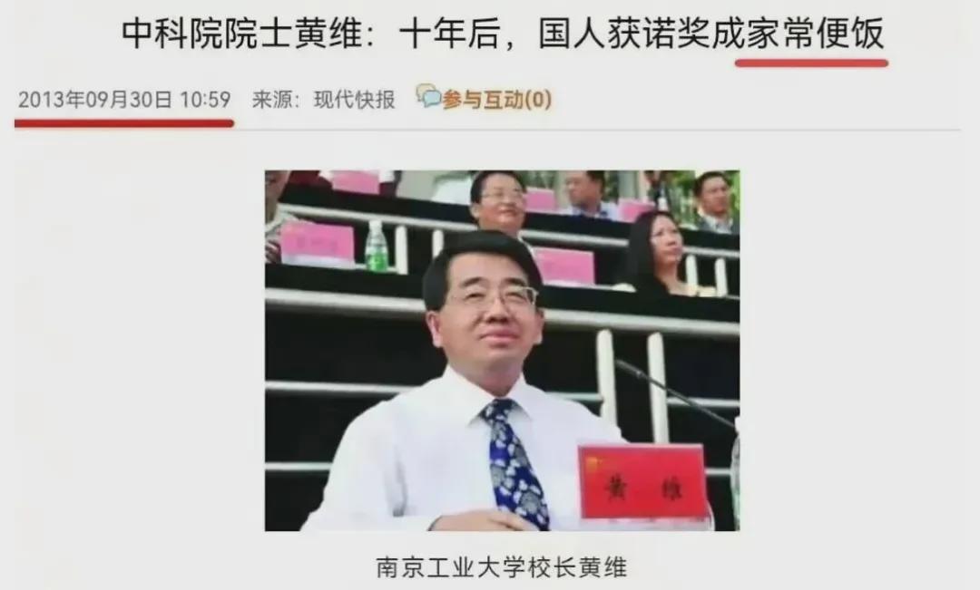 而2013年,南京工业大学校长、中国科学院院士——黄维在该校的开学典礼上也“口出狂言”:“十年之后的中国,像诺贝尔奖这样的国际性重要指标,在中国大地出现应该将会成为常态,而不是个案。”