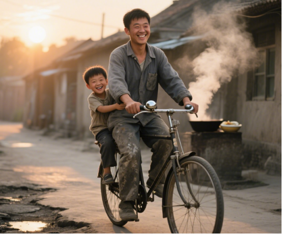 那时候的他,脸上总挂着笑,尤其是在工地下班,骑着那辆除了铃铛不响哪儿都响的二八大杠自行车,快到家时,远远就能看见巷子口那个小小的身影。