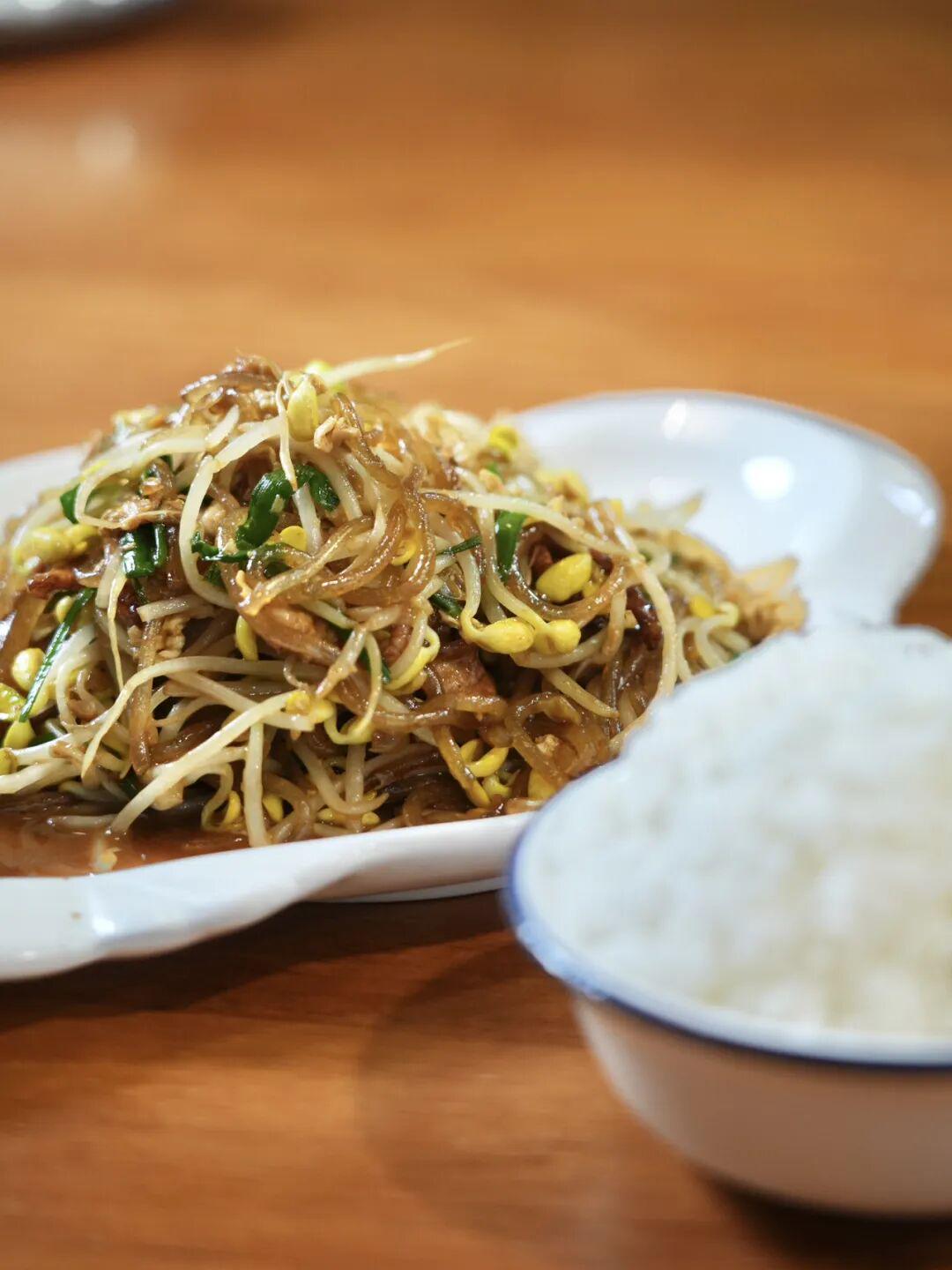 夹一筷子送入嘴里,舌尖先感受到的是弹软的粉条,嚼几下便有着豆芽的沙沙脆响,又伴有肉香与嚼劲,味道清淡平和,口感却丰富,妥妥的下饭菜。