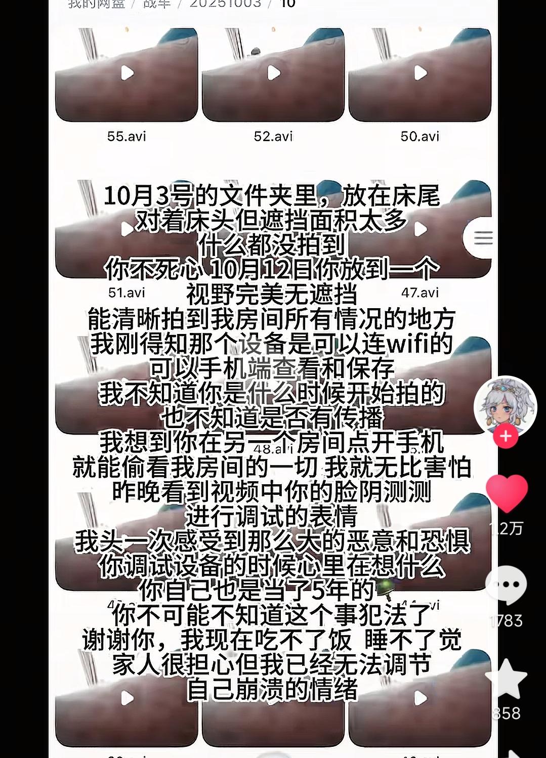 根据爆料女生提供的视频来看,合租男生是将一个充电宝加另外一个录音设备放到了女生床尾,因为女生床上有很多娃娃,所有他偷拍了很久才发现。