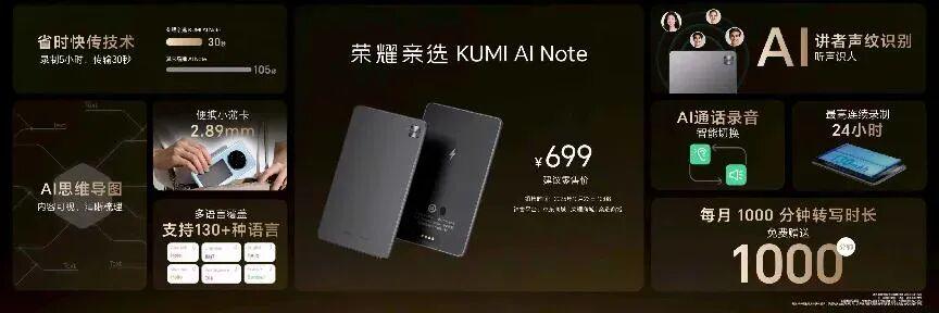 荣耀亲选AI NOTE是一款可以磁吸在手机背后的AI录音卡片,可以快速录音,生成会议纪要、思维导图,附带声纹识别,2.89mm厚度。10月23日开售,仅需699元,每月赠送1000分钟免费转写时长。