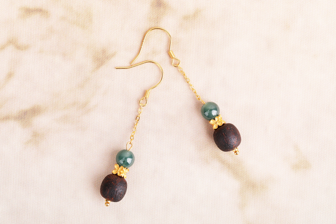而这系列沉香耳环所用沉香珠通过我们实际试验测评,均为九分沉水,可谓是香中臻*品。