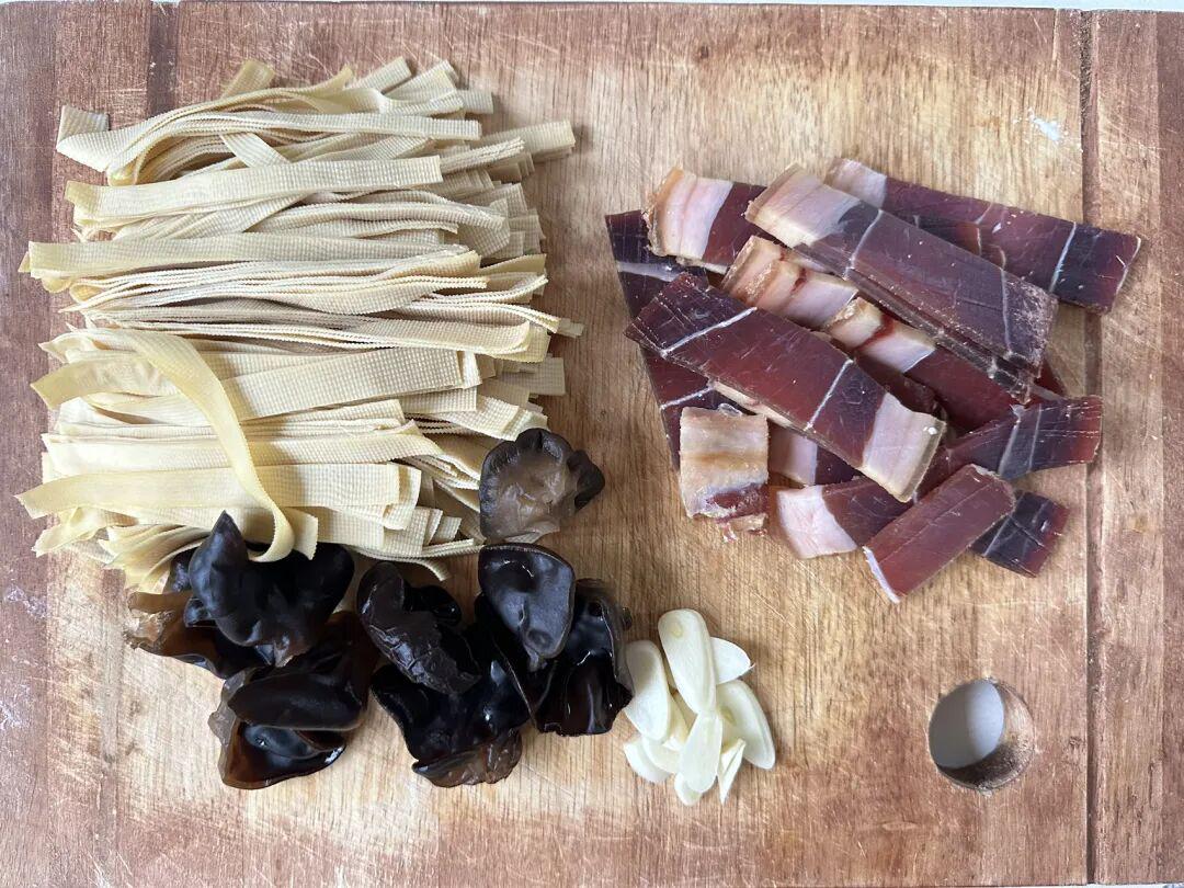 1、准备2张千张,切成小条、木耳提前泡发,洗净备用、大蒜2个切片备用、腊肉切成薄片备用;