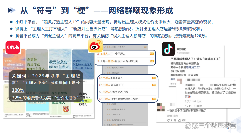 网络群嘲现象:微博、小红书、抖音等主流平台对 “主理人” 的负面声量远超正中性声量,各平台负面标签不同,如微博聚焦 “不理人、咖啡刺客”,小红书侧重 “性价比低、体验差”,抖音关注 “傲慢服务、规则奇葩” 等;且相关吐槽内容热度高,如抖音模仿视频点赞超 120 万,“主理避雷” 搜索量同比增 300%。
